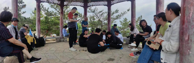 我們不僅是一個(gè)團(tuán)隊(duì),還是一個(gè)有愛的大家庭,大家在山頂休憩,互相分享美食。